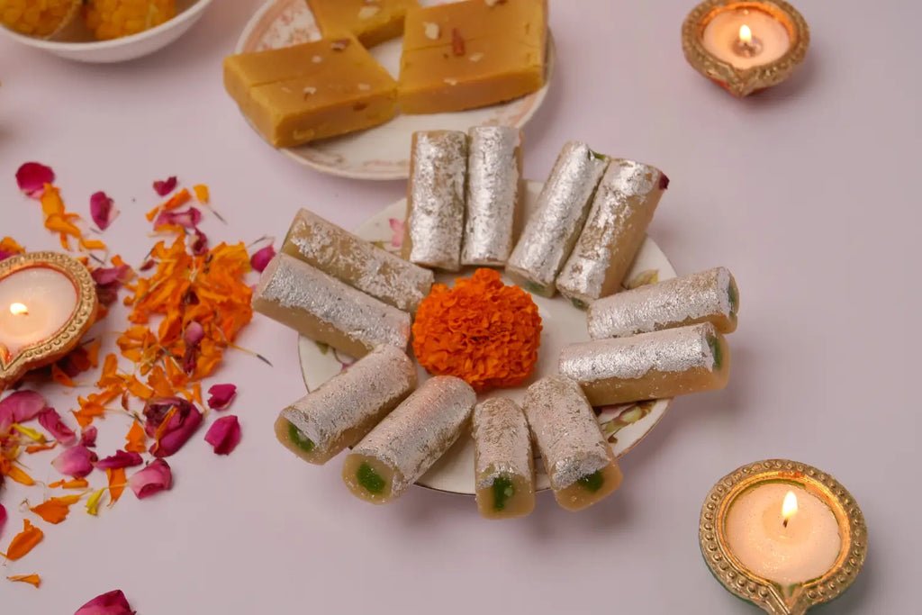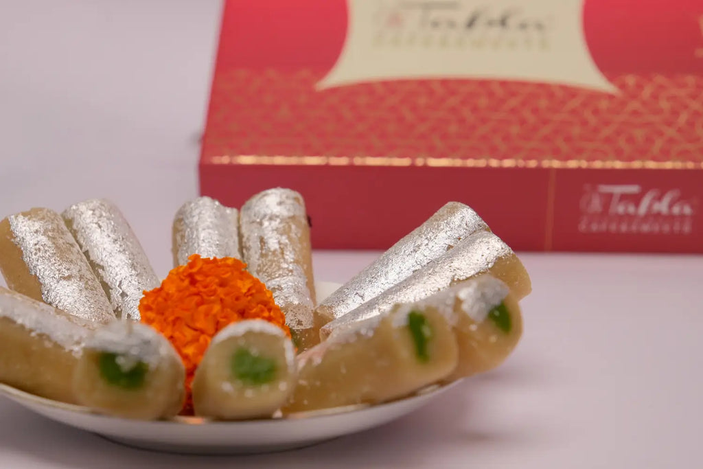 Kaju Pista Roll is a luxurious Indian sweet crafted from rich cashew dough rolled around a flavorful pistachio filling. Soft, smooth, and delicately sweet, each piece offers a perfect blend of creamy cashew and aromaticpista— a true festive indulgence.